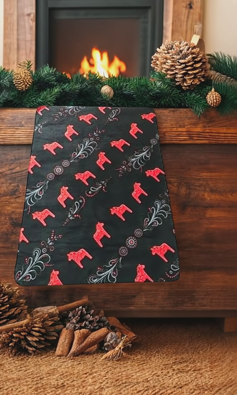Blanket: Dala Horse, Fleece, Black Blanket with Red Swedish Dala Horses, White on Reverse Side