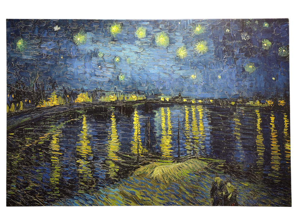 Starry Night Over the Rhône is a famous 1888 Post-Impressionist painting by Vincent van Gogh, capturing a night scene with stars, gaslight reflections in the Rhone river, and a couple strolling, showcasing his signature bold brushwork and vibrant colors, housed at the Musée d'Orsay in Paris. Painted near his Yellow House in Arles, France, it explores light and atmosphere, differing from his more turbulent The Starry Night.