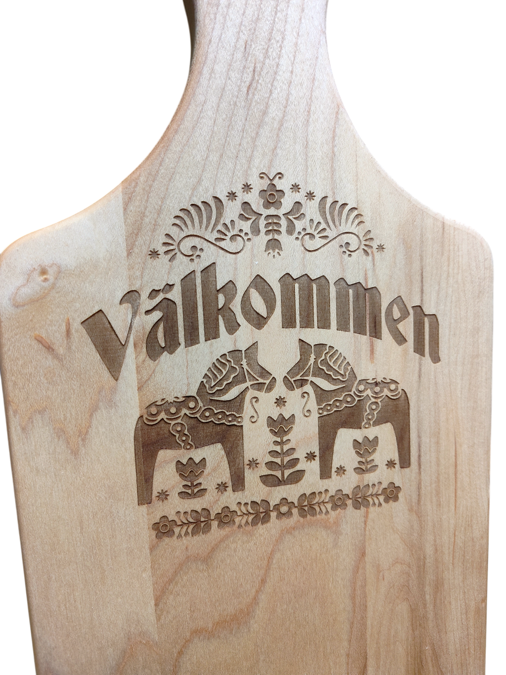 Celebrate the heart of Swedish hospitality with this beautifully engraved wooden cutting board. Crafted from light, natural wood, the board features the word “Välkommen”—Swedish for Welcome—surrounded by traditional folk motifs that are deeply rooted in Sweden’s cultural heritage.