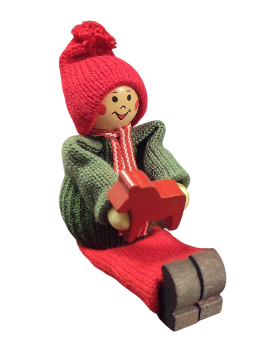 4" figure with green knit coat, red hat, black wooden boots and a striped scarf. His face is hand painted and he's holding a red Dala Horse.