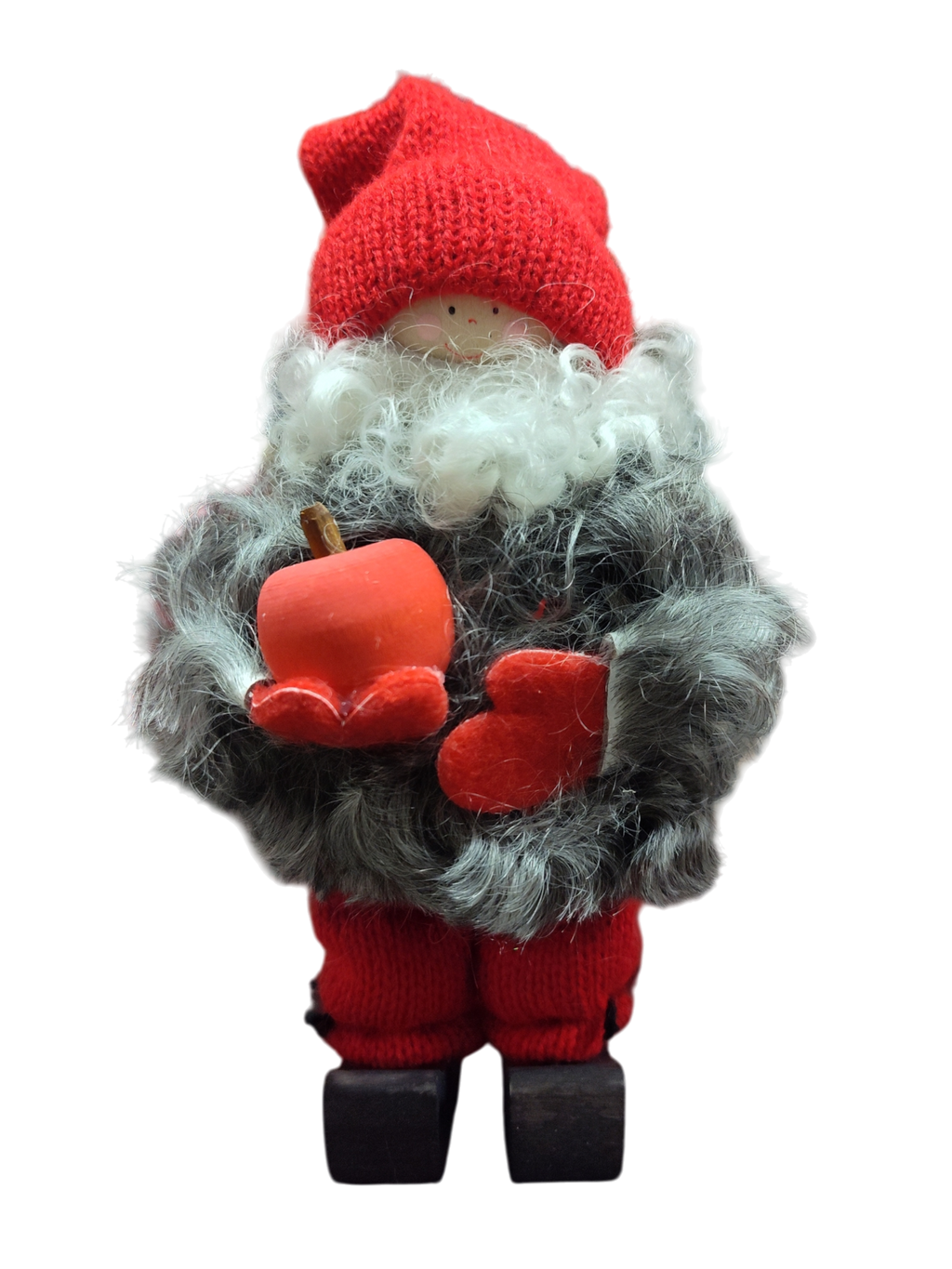 This charming tomte figurine features cozy red knit pants that perfectly match his knit hat and gloves, creating a warm, festive look. He has a soft white fluffy beard and a gray fluffy top that adds texture and comfort to his design. Finished with classic black wooden shoes, this tomte holds a bright red apple gently in his palm, symbolizing warmth, generosity, and tradition. Full of Scandinavian charm and handcrafted character, this figurine makes a delightful addition to holiday décor, shelves, or gift displays.