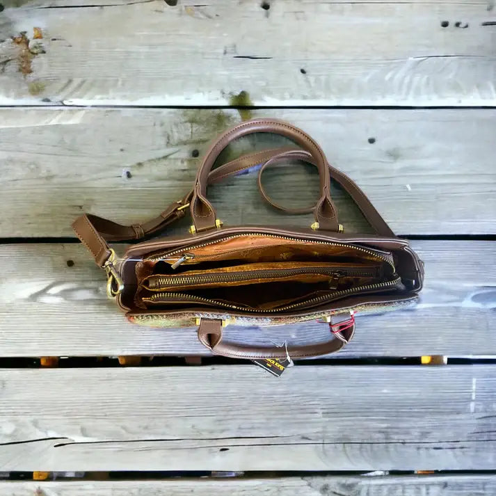 The Double Handle Harris Tweed Tote Bag with Paisley interior is a luxurious and fashionable accessory that seamlessly blends classic elegance with a touch of whimsy. Crafted from the finest Harris Tweed, a fabric renowned for its quality and authenticity, this tote bag exudes sophistication and charm. The exterior of the bag showcases the timeless beauty of Harris Tweed, with its distinctive herringbone pattern and rich, earthy tones. The sturdy double handles, provide a comfortable grip and add a touch of refinement to the overall design. Whether carried in hand or on the shoulder, this tote bag exudes a sense of effortless style.