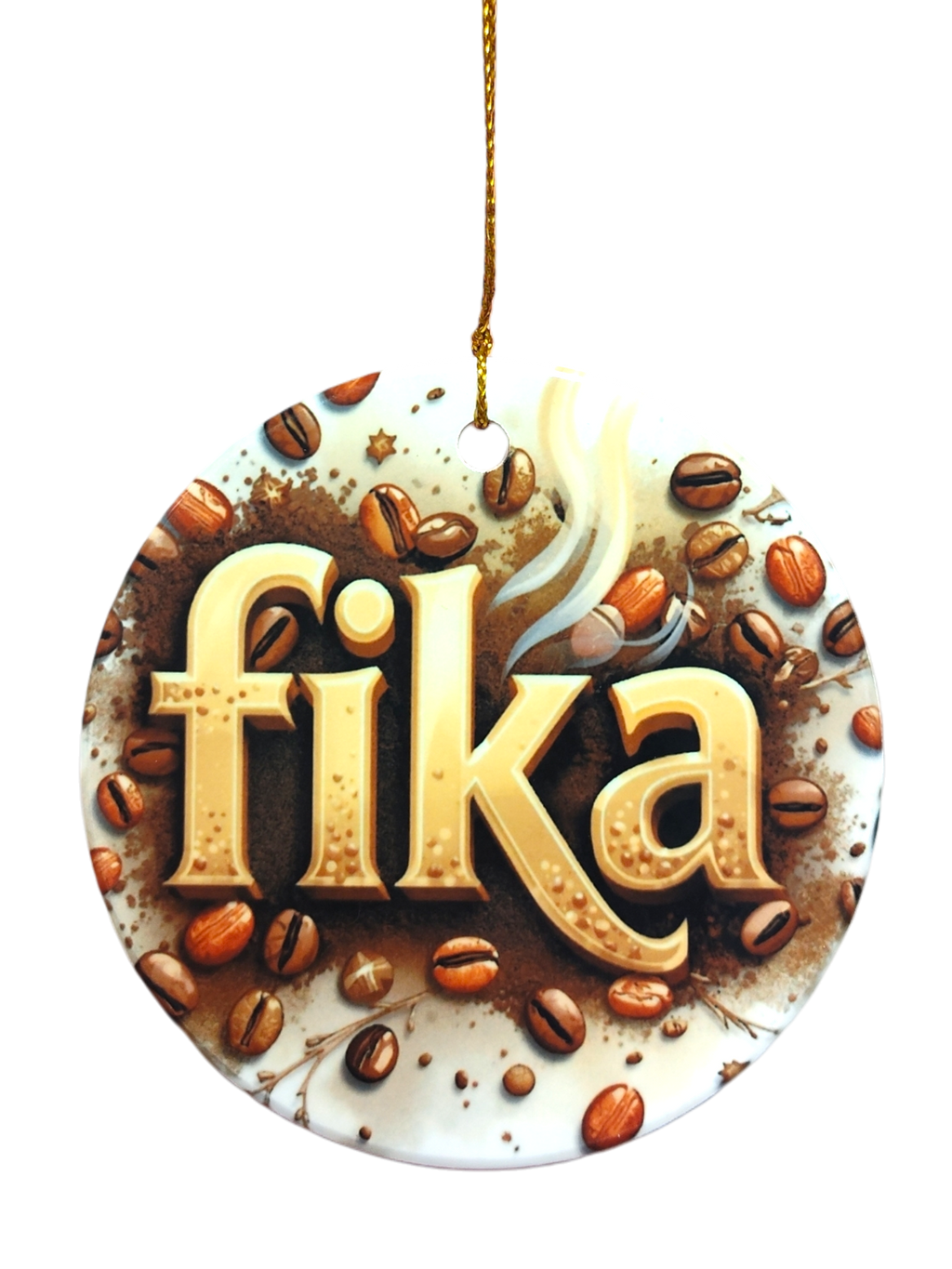 This charming ceramic circle ornament features the word “Fika” displayed on a clean white background, celebrating the beloved Scandinavian coffee tradition. Beneath the lettering, textured coffee grounds add a warm, earthy detail, while scattered coffee beans surround the design for a cozy, café-inspired touch. Simple yet inviting, this ornament is perfect for coffee lovers and anyone who appreciates the ritual of slowing down and savoring the moment. A delightful addition to holiday décor or a thoughtful gift for fans of Nordic culture and coffee alike.