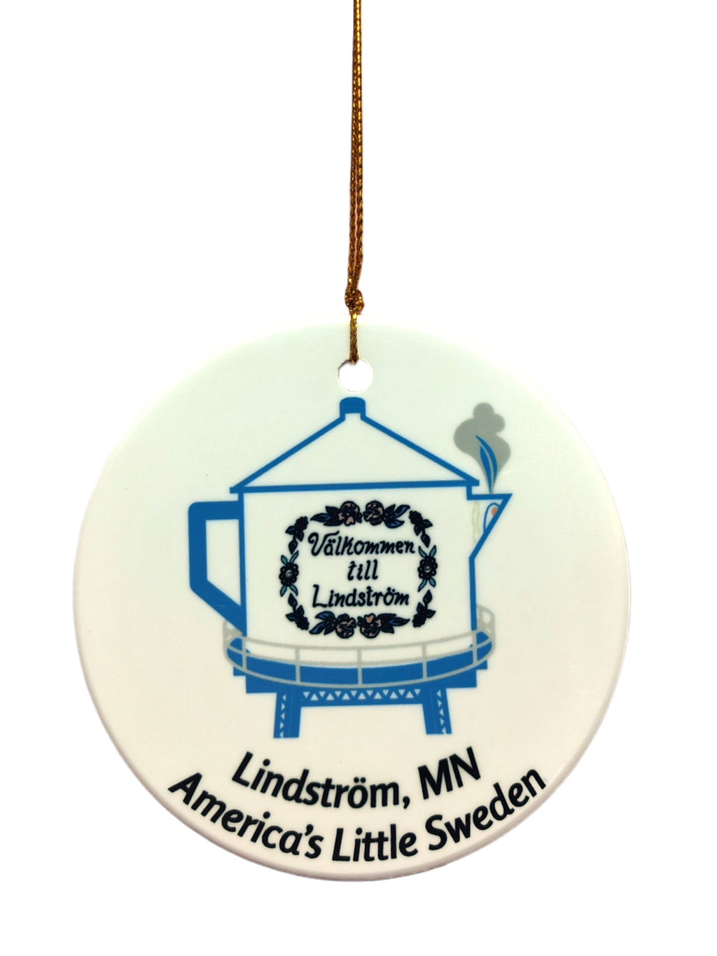 This white ceramic circle ornament features a illustration of the iconic teapot-shaped water tower adorned with cheerful floral accents. Centered on the tower is the phrase “Välkommen till Lindström,” welcoming viewers to the heart of Minnesota’s “Little Sweden.” Beneath the water tower, the text reads “Lindström, MN – America’s Little Sweden,” celebrating the town’s rich Scandinavian heritage. Clean, bright, and full of local pride, this ornament makes a meaningful keepsake for residents, visitors, and anyone who holds Lindström close to their heart.