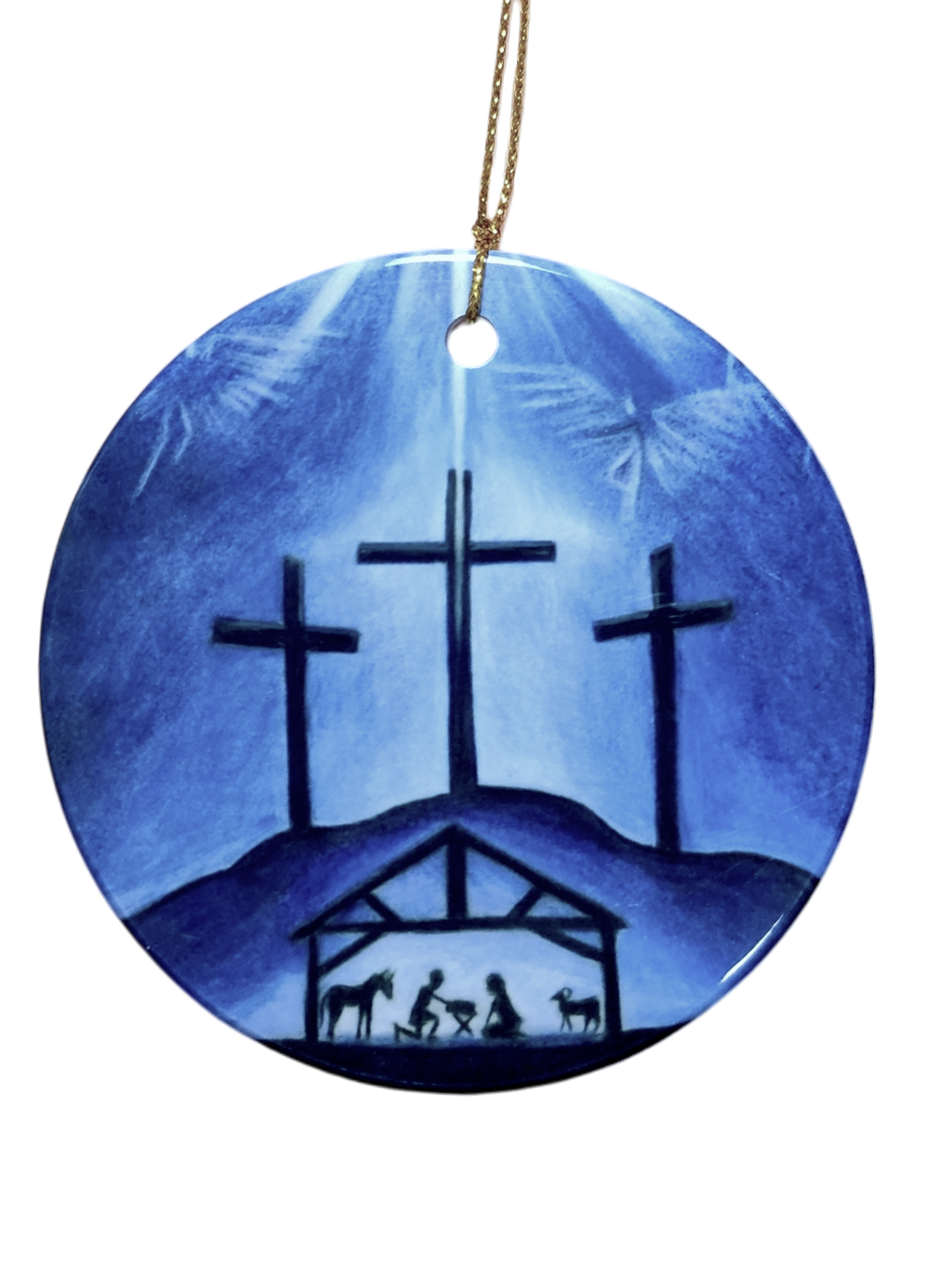 This meaningful ceramic circle ornament depicts three crosses standing atop a gentle hill, symbolizing faith and sacrifice. Above the crosses, faint images of angels appear, watching over the scene as a soft white glow radiates from the top of the ornament, creating a heavenly atmosphere. Beneath the hill, a simple shelter protects a sacred nativity scene featuring baby Jesus, Mary, and surrounding figures including a horse and a goat. Rich in spiritual symbolism and quiet beauty, this ornament serves as a powerful reminder of hope, devotion, and the true meaning of Christmas.
