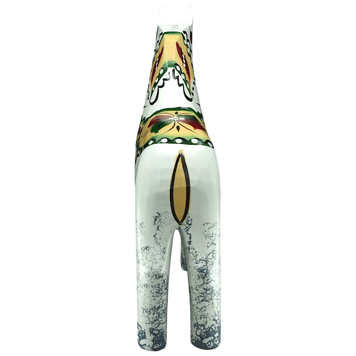 This Dala horse design was inspired from an antique Dala horse pattern from the 1880s to 1920s. It has more detail than today's Dala Horse design. The Kurbits are painted with gold, red, black, and blue or green and it has a matte finish. The legs and feet are splotched with gray paint.