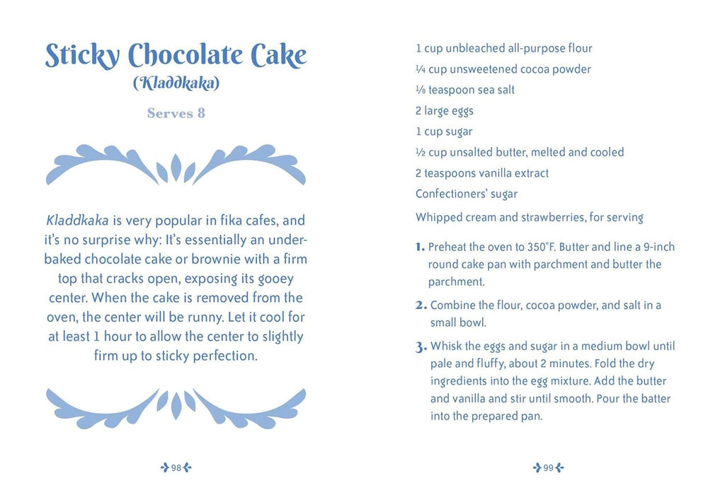 A: This hard-cover guide includes cultural insights into fika as well as tips for practicing it, plus recipes for traditional Swedish fika treats such as cinnamon buns (kanelbullar), cardamom buns, chocolate balls, gingerbread cookies, and semlor.