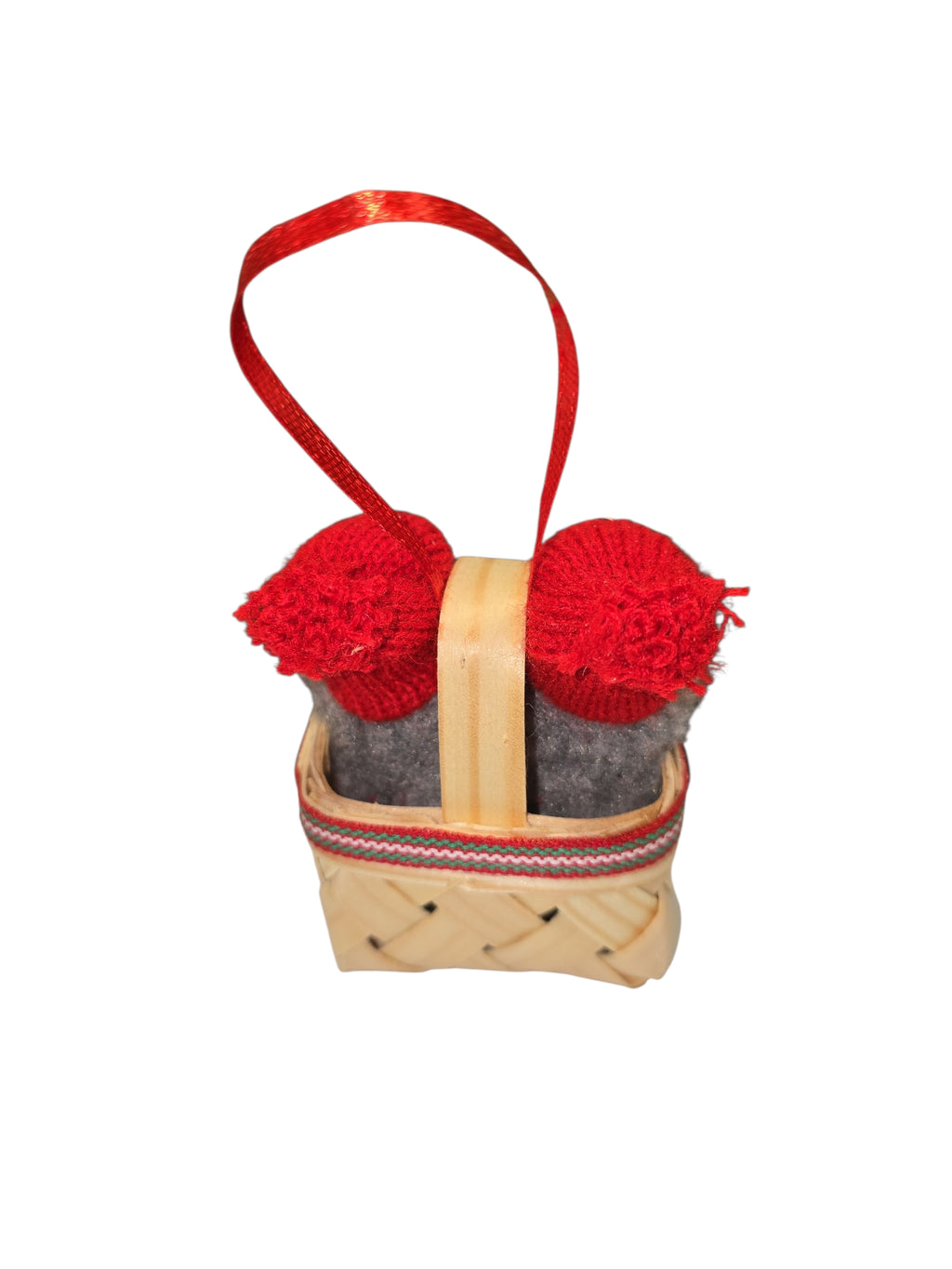 This super cute piece is the perfect decoration to sit on a shelf or be hung on your tree during the Christmas season! It features two Santa figures with soft fluffy beards, red knit hats, and soft gray hair. They sit in a woven basket with a heart bow. Handmade in Sweden.