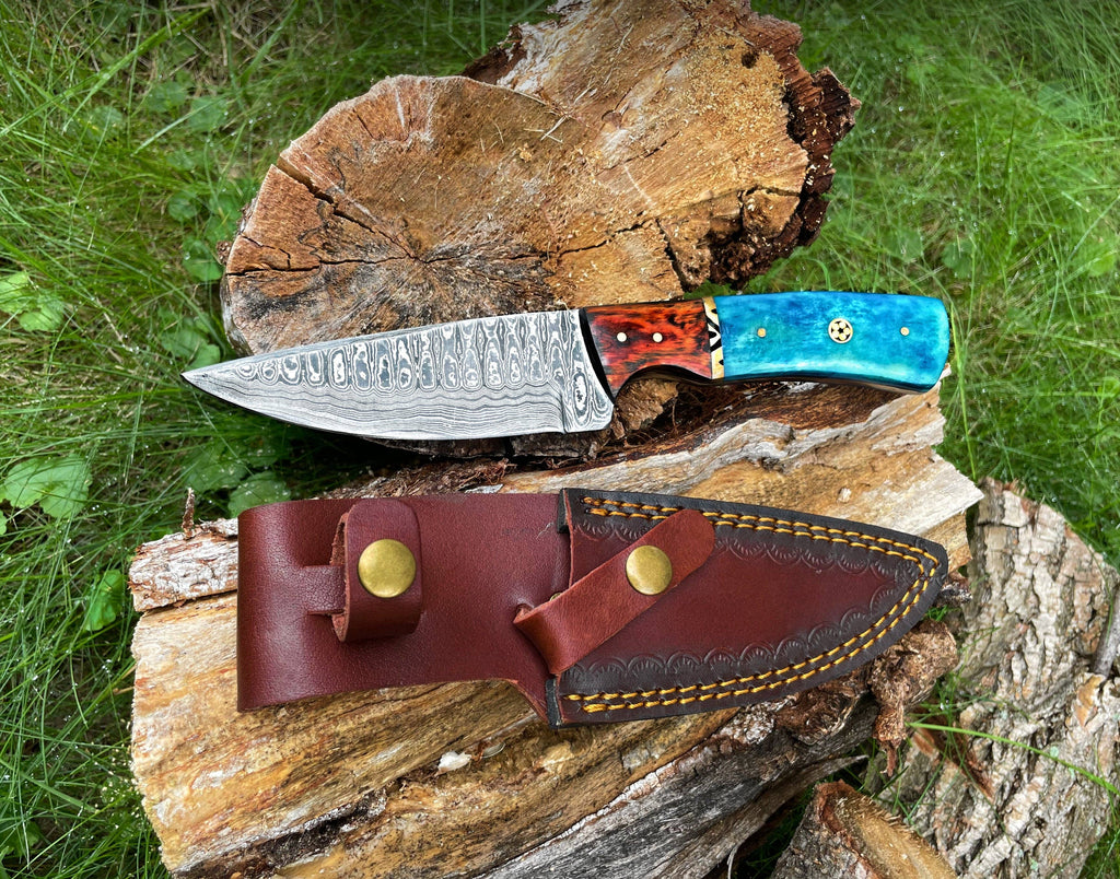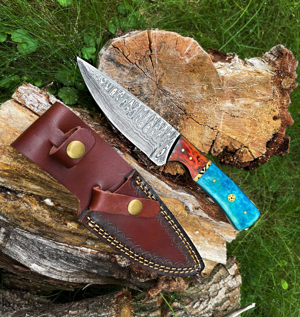 Titan International Knives Damascus Hunting/utility knife is hand crafted to be functional and not just for looks. Utility Knife has over 18 hrs of work into it including forging, filing, fitting, grinding, polishing. The Black Walnut scales are locked in place with the multiple Brass pins. The handle give a very smooth yet sturdy grip which feels natural when held in the hand. The knife is weighted to have a balance point just right where the blade meets the handle, to better help in hunting Jobs. Remarkable workmanship on this knife! Damascus steel hand forged with combinations of 1095 High Carbon and 4340 High Tensile Steel forming over 450+ layers.