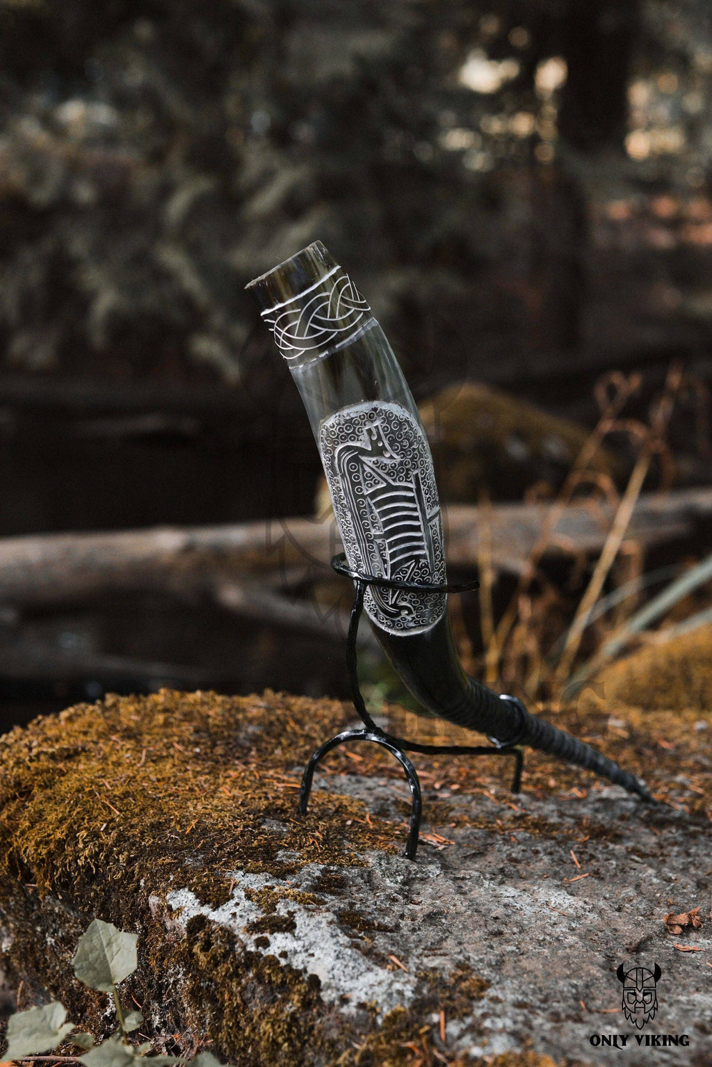 - Hand-Carved Detail – Viking ship and raven motifs etched into natural horn