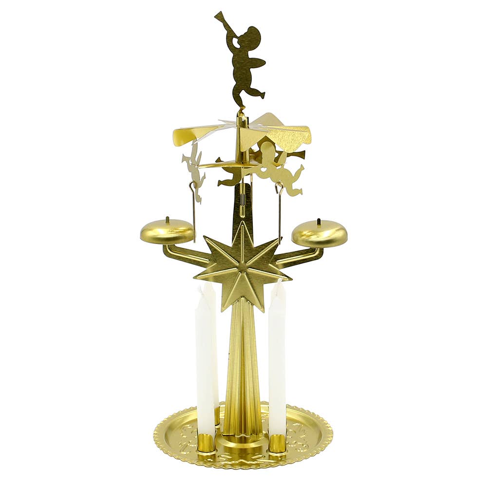 This charming nostalgic set of brass-plated angel Christmas chimes is made in Germany. The set comes in its own small box with assembly instructions on the back. It holds four small candles on the base, which are included. An angel at the top and two small chimes in the middle. As the angels spin from the candle heat, they gently strike the chimes with the small rods hanging from them, creating a beautiful and calming sound.