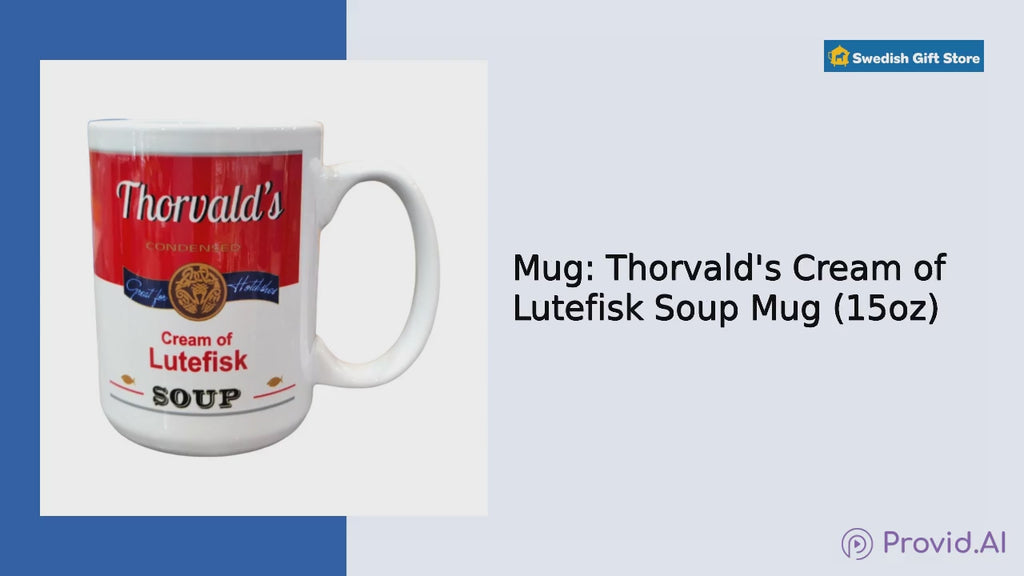 - Design: Retro soup can aesthetic featuring “Thorvald’s Cream of Lutefisk Soup”