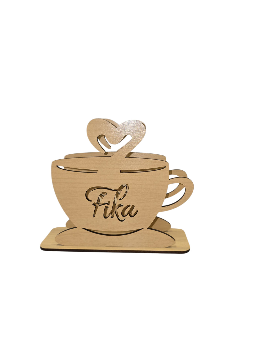 This contemporary natural birch napkin holder is laser cut into the shape of a coffee cup on both sides with the word Fika cut out. (A Swedish Coffee Break with Sweets and Friends)