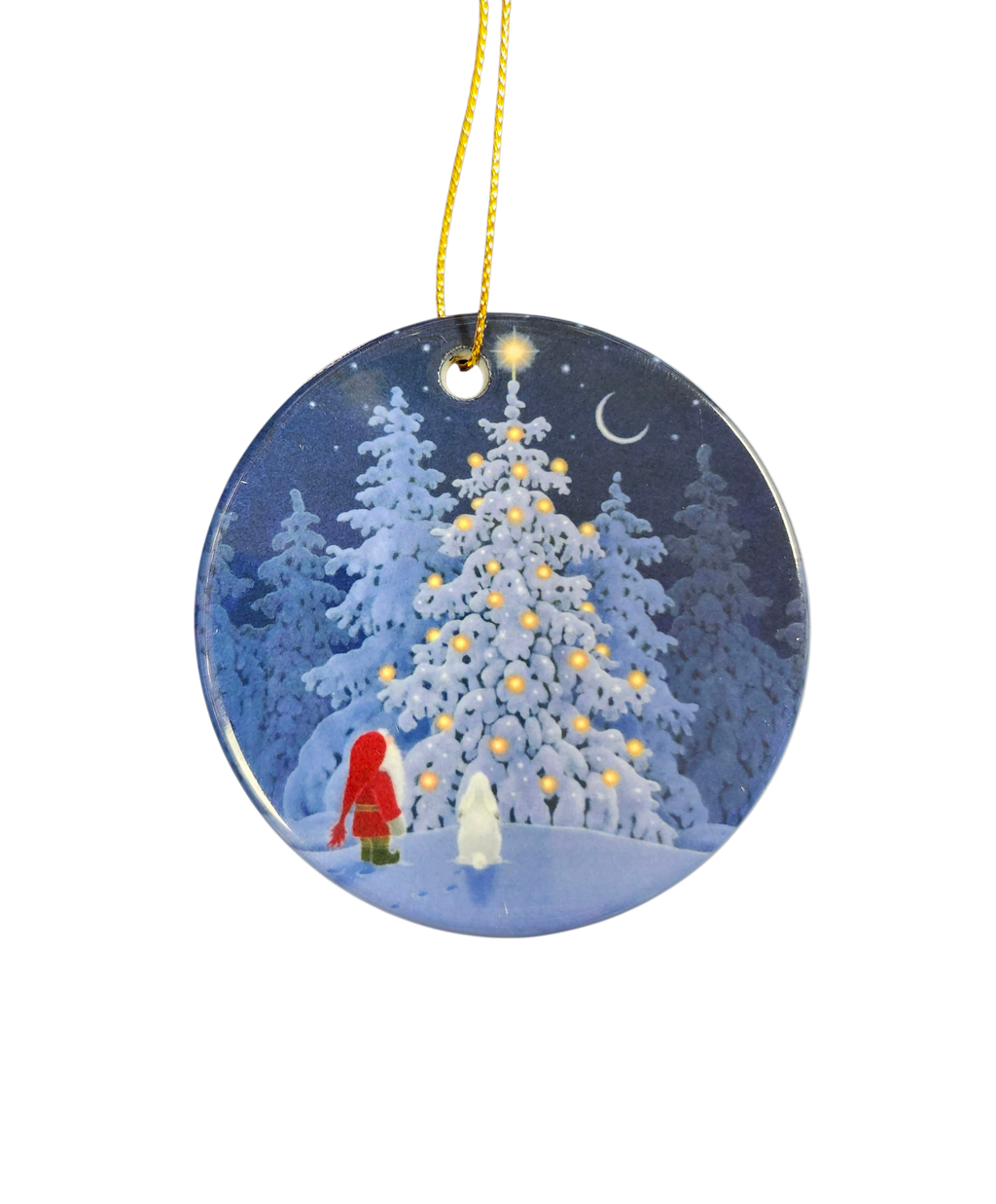 Ornaments measure approximately 2.75" in diameter. Featuring artwork by Eva Melhuish, this round ornament will add the perfect Scandinavian charm to your tree this upcoming holiday. The ornament features a Tomte and a white rabbit admiring a light up pine tree. These are the perfect addition to any tree or decoration project.