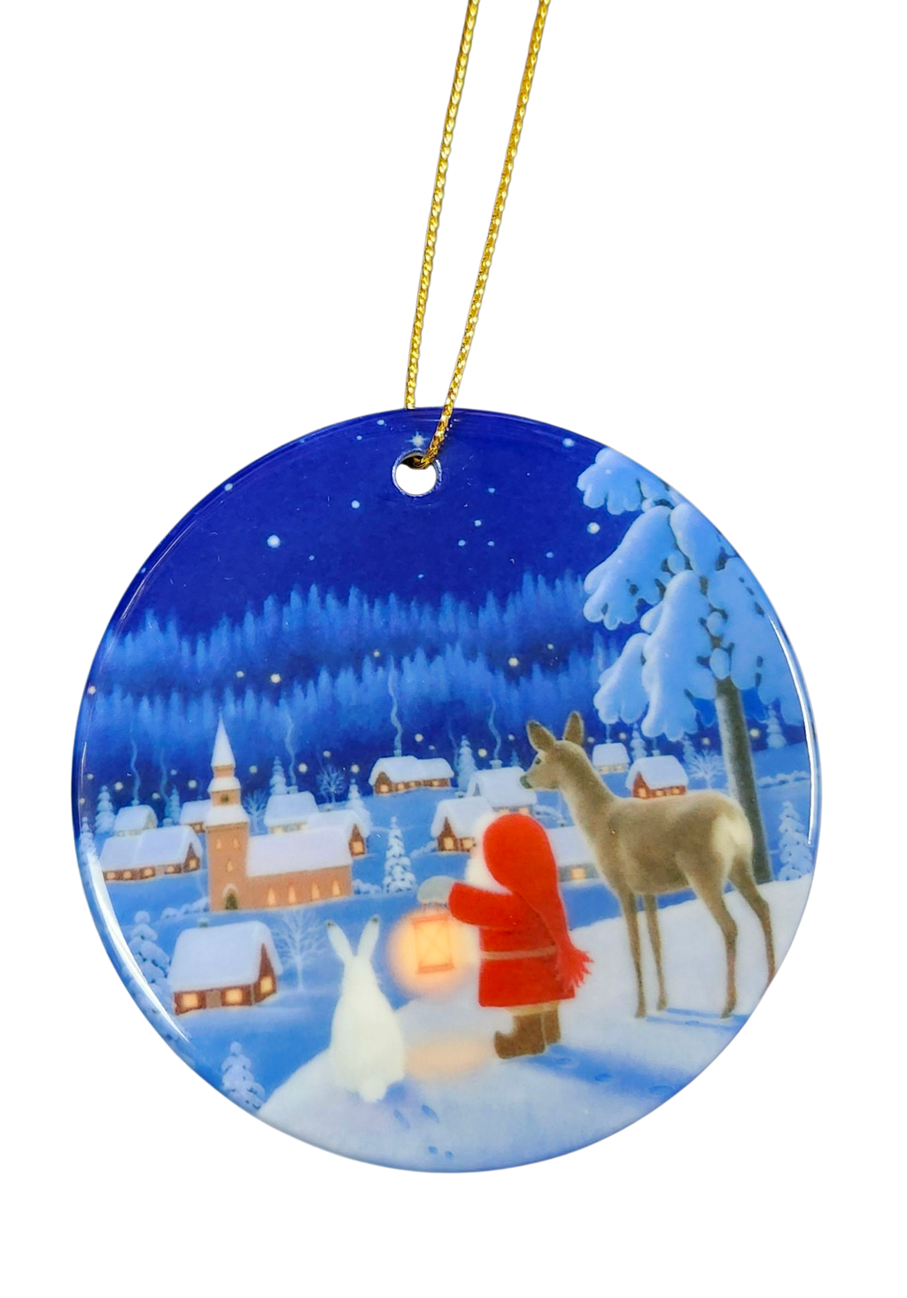 Celebrate Swedish holiday traditions with this charming porcelain ornament featuring a Tomte riding a reindeer alongside a curious rabbit, illustrated by beloved artist Eva Melhuish. Each ornament is hand-cut with scalloped edges, giving it a unique, handcrafted feel that adds warmth and character to any tree or seasonal décor.