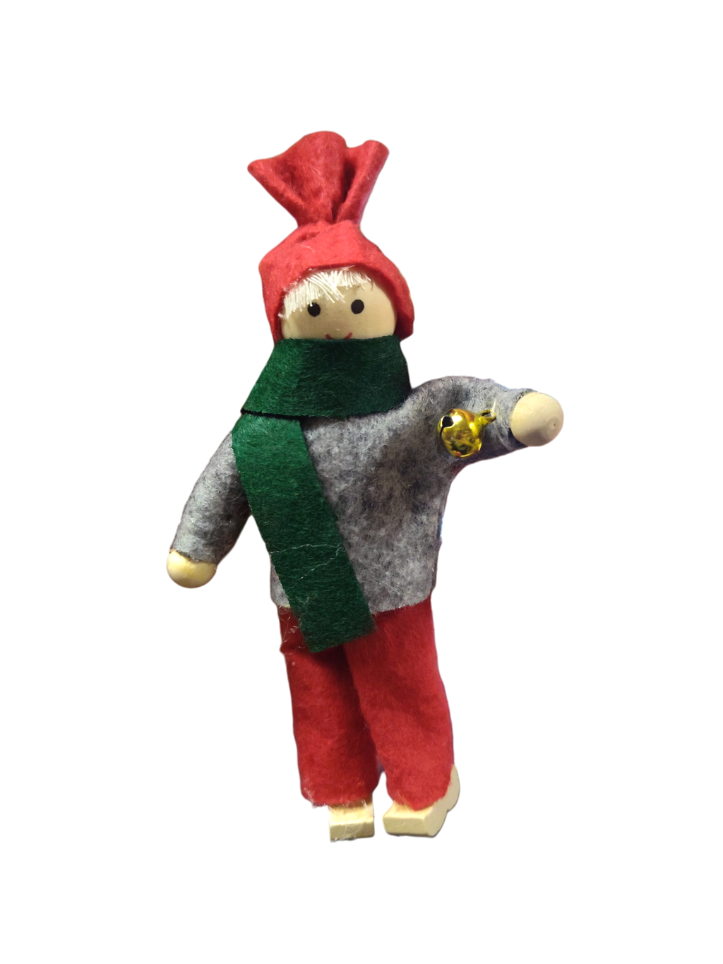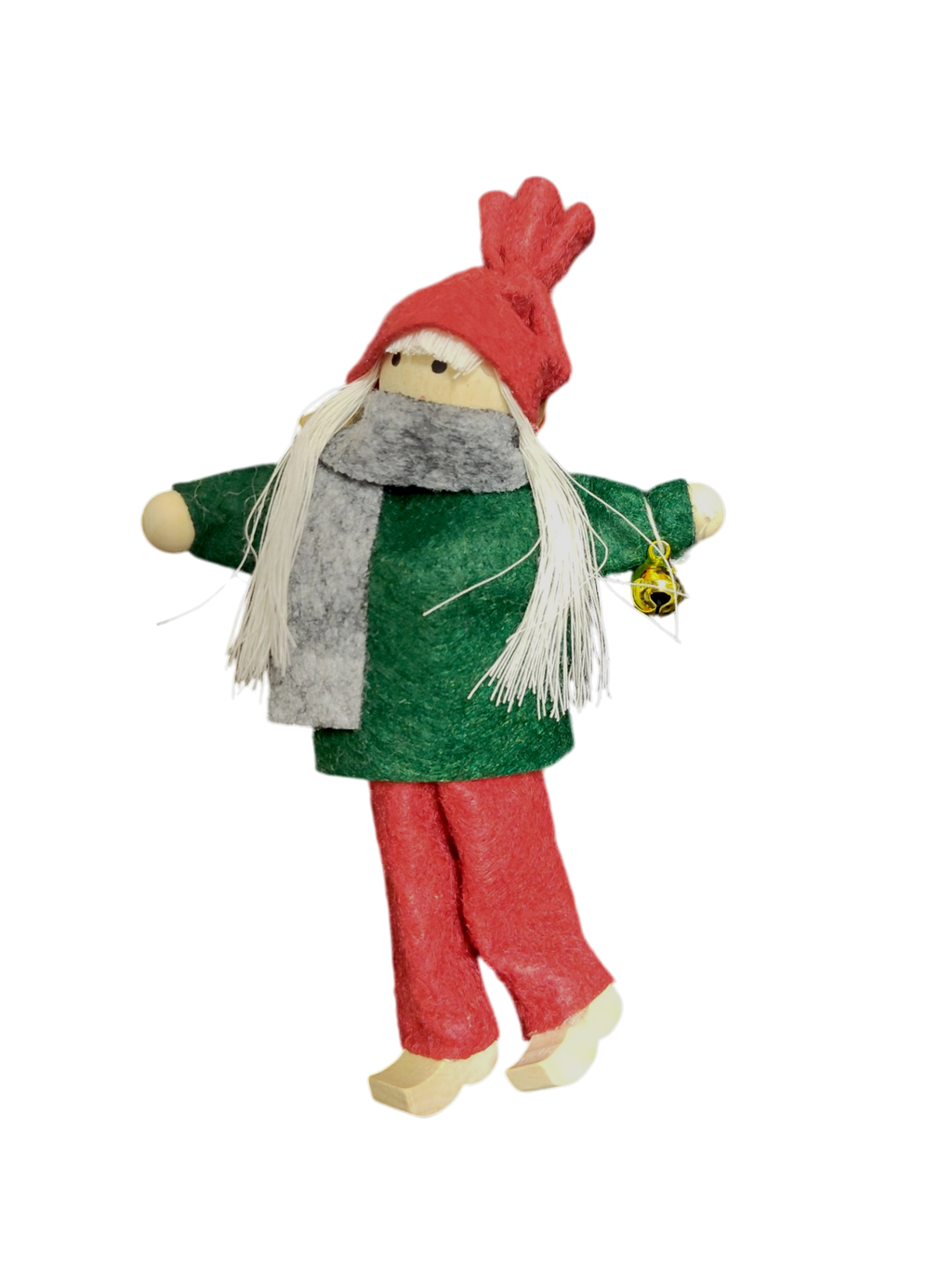 Swedish Tomte Girl or Boy Christmas Tree Ornament Dressed in Red & Green with Wooden Clogs