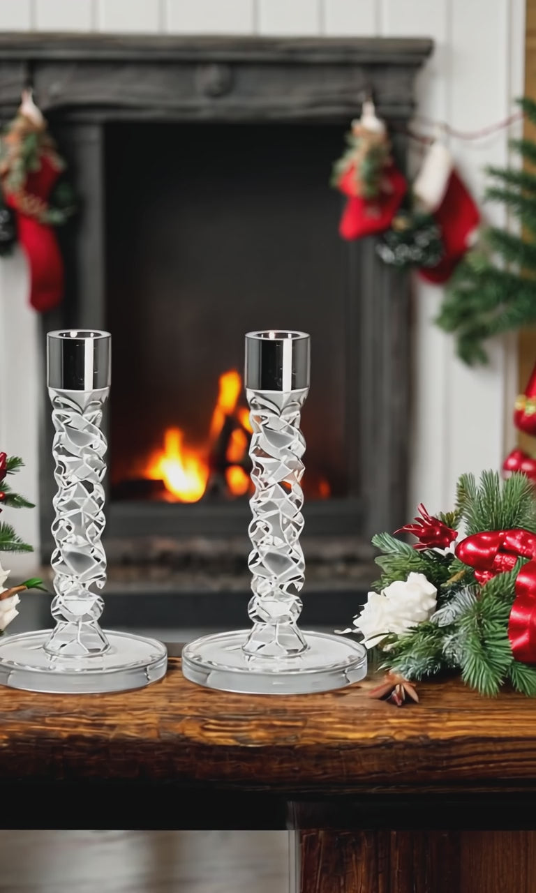 The Carat collection is based on a contemporary interpretation of the traditional cut glass for which Orrefors is world-renowned. The irregular geometry produces beautiful reflections of light in the crystal. The medium candlestick in clear glass is available as a set of 2 with details in stainless steel. Designed by Lena Bergström.
