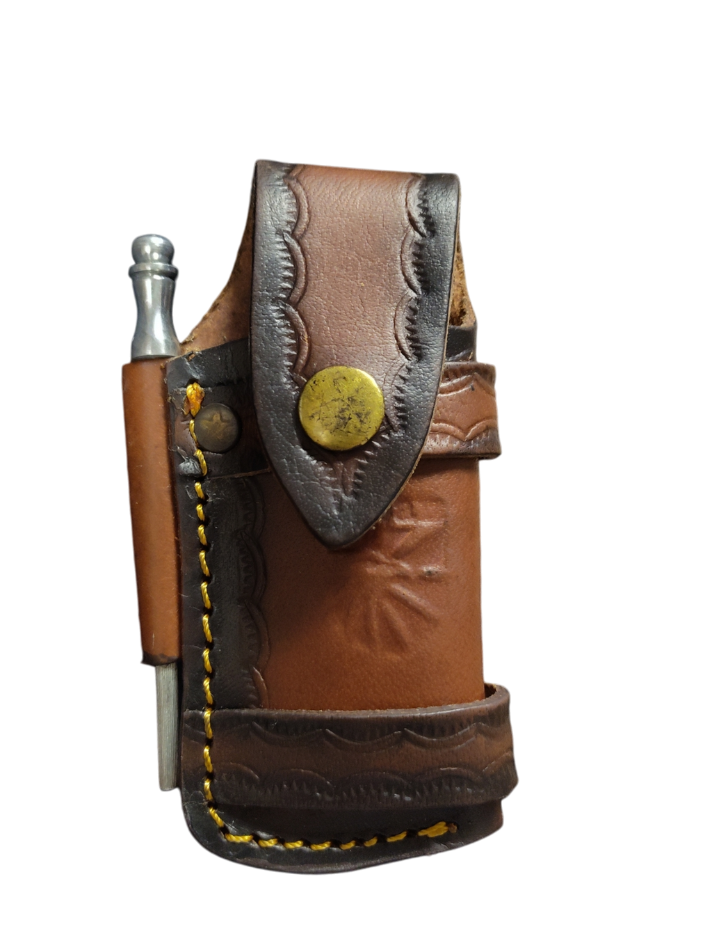 - Hand-Carved Spine, Walnut Scales , Sharpening Steel, Clip Point Blade, Lock Back Folding Knife, Engraved Camel Bone Scales, Lanyard Hole, Hand Stitched Leather Sheath