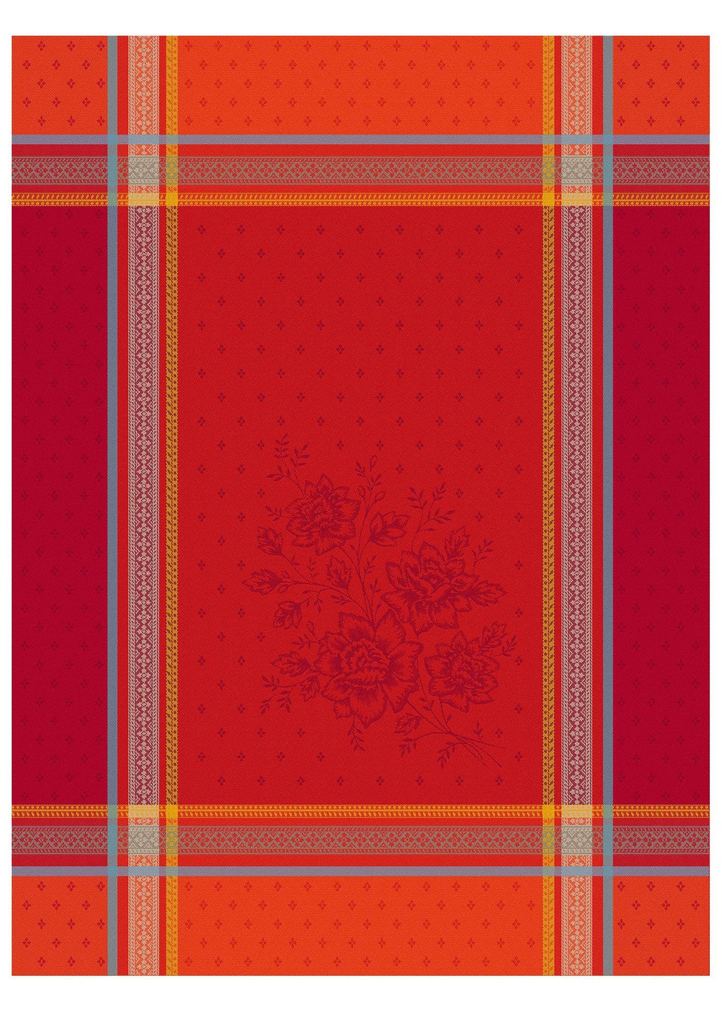 This European-made tea towel exemplifies authentic Provençal design through traditional jacquard weaving, where pattern and color are interlocked directly into the cotton fibers. The 20"x28"" construction in 100% cotton showcases a striking bright red base with deep crimson florals running down the center, framed by a border in yellow, blue, and tan. The reversible weave reveals inverted colors on the back, offering design flexibility. Coordinate with the matching table runner to complete your table setting with European heritage craftsmanship.