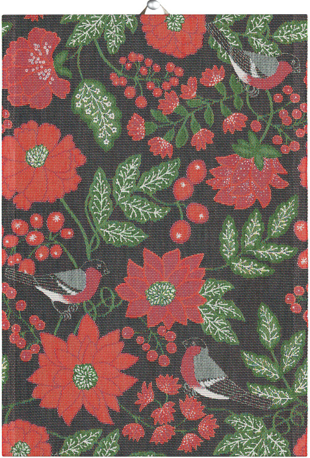 The "JULFÅGLAR" kitchen towel showcases a striking black background adorned with vibrant red flowers, green leaves, and elegant birds in shades of black and red. This bold yet classic design brings a touch of Scandinavian charm to your kitchen decor. Expertly woven from 100% organic cotton by Ekelund Master Weavers, it combines timeless artistry with everyday practicality. A hanger tag is sewn into the top center for easy display or drying.
